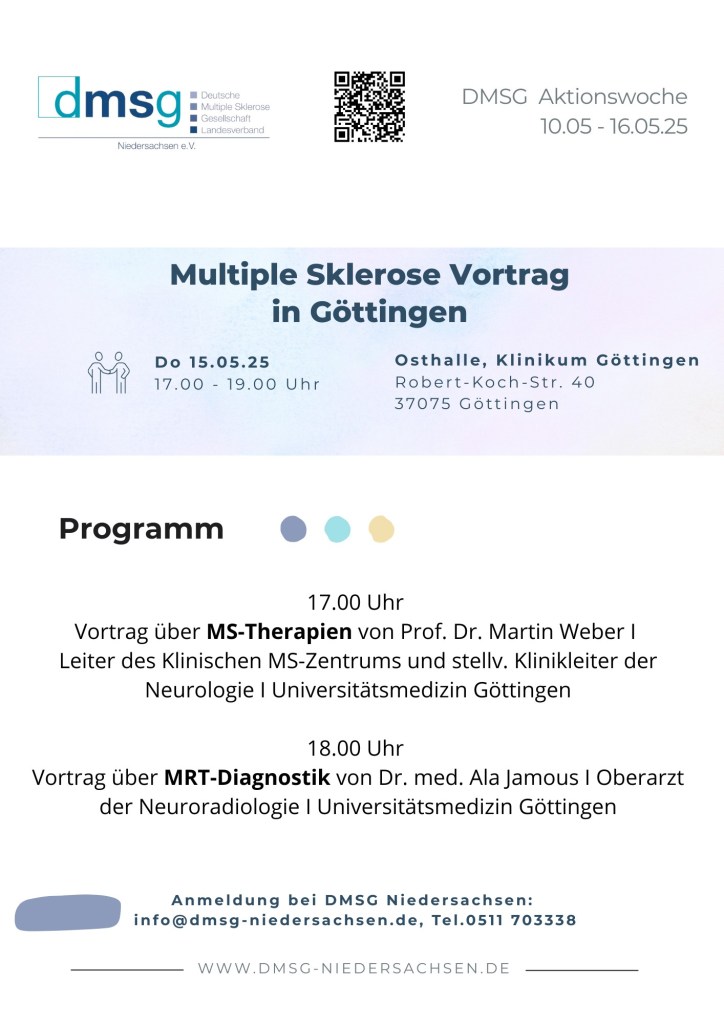 Auch in diesem Jahr 2025 findet in der Osthalle der Universitätsmedizin Göttingen ein Vortragsabend Rund um die MS-Therapien und MRT-Diagnostik statt, zu der wir herzlich einladen. Die Kontaktgruppe Göttingen wird mit einigen Mitgliedern und dem Koordinator Mathias Düring vertreten sein.